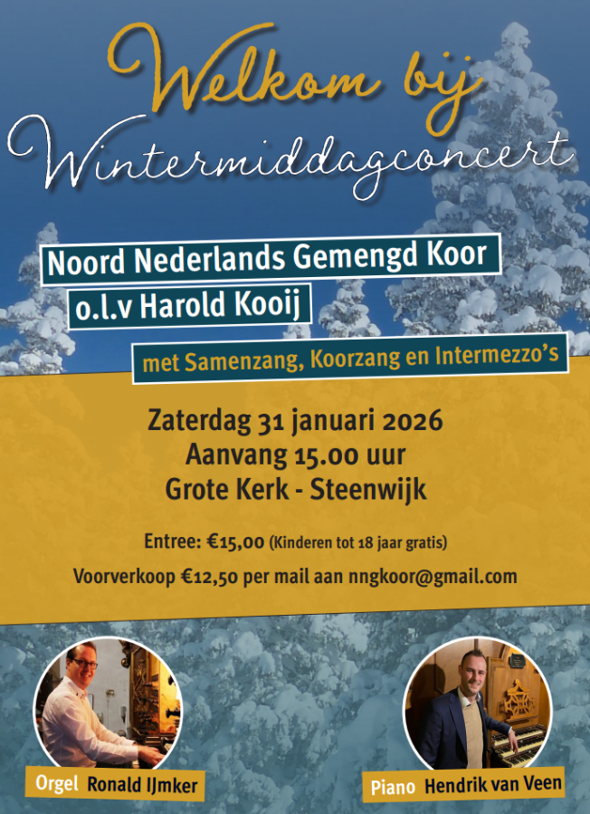 ![]() Het Noord-Nederlands Gemengd Koor treedt zaterdag 31 januari op in Steenwijk. Het koor staat onder leiding van dirigent Harold Kooij. Met medewerking van pianist Hendrik van Veen (Urk) en organist Ronald IJmker (Nieuwlande).Het Noord-Nederlands Gemengd Koor met ca. 75 koorleden geeft ieder jaar in meerdere kerken concerten. De geoefende zangers komen uit heel Noord Nederland; van Dokkum tot Steenwijk en van Stadskanaal tot Hoogeveen. | ||
