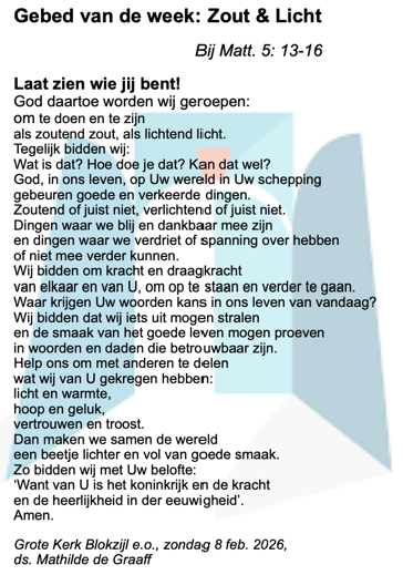 Want Jezus zei in de Bergrede tegen zijn leerlingen: ‘Jullie zijn het zout der aarde. Maar als het zout zijn smaak verliest, hoe kan het dan weer zout gemaakt worden? Het dient nergens meer voor, het wordt weggegooid en vertrapt. Je zet geen lamp aan om hem vervolgens onder een emmer weg te zetten. Zo moet ook jullie licht schijnen voor de mensen, zodat zij jullie goede daden kunnen zien en eer bewijzen aan jullie Vader in de hemel’ (Matt. 5: 13-16). Dat is natuurlijk een spannende en uitdagende vraag. Want: hoè ben je dan als zout of als licht? Kunnen wij de hele wereld op ons nek nemen? Wij kunnen de wereldvrede niet bewerkstelligen. | ||