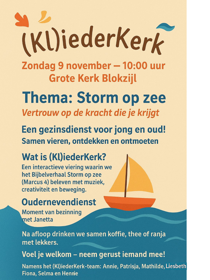 De Zondagsbrief verschijnt wekelijks op vrijdag. In de Zondagsbrief staat informatie over actuele zaken van de komende week. Denk aan lief en leed, iets leuks voor de kinderen, informatie over de dienst en een wekelijkse overdenking. De Zondagsbrief wordt wekelijks verstuurd via de mail en op zondag uitgereikt in de kerk. Annie de Lange en Geke Marsman verzorgen samen de redactie. Zondagsbrief ontvangen?Meld je aan via redactiezondagsbrief@pknblokzijl.nlKopij aanleveren? Uiterlijk vrijdag vóór 18.00 uur. redactiezondagsbrief@pknblokzijl.nl | ||